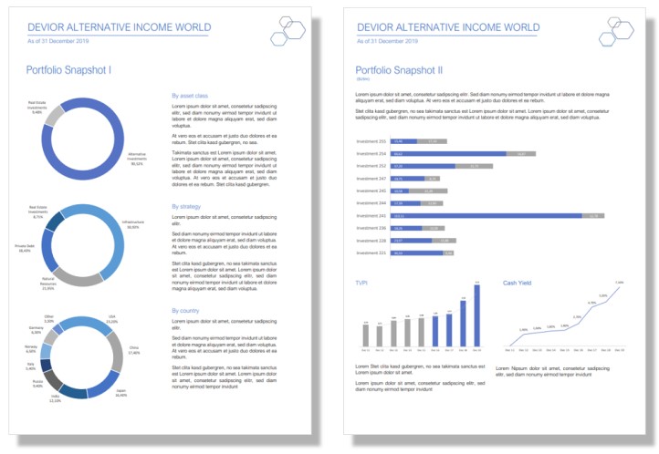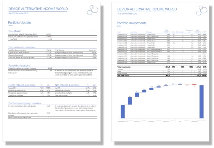 In order to save you time and trouble, Devior helps you with data capturing and reporting. We capture all the data (cashflows, valuations, attributes) from quarter reports, annual statements, capital account- and cashflow statements for you! Your job? Focus on the more important things!